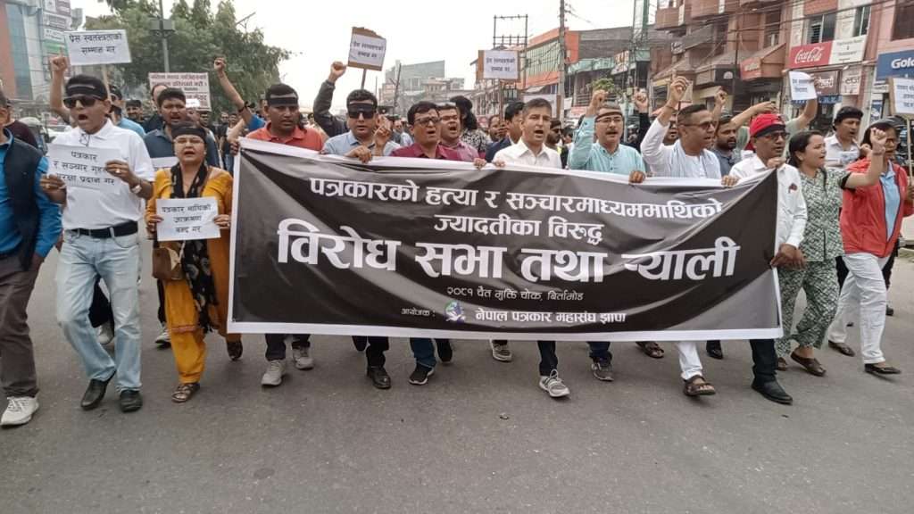 बिरोध प्रर्दशनकै क्रममा नेपाल पत्रकार महासंघ झापा शाखाले पनि झापाको बिर्तामोडमा बिरोध प्रदर्शन गरेको हो । बिर्तामोडमा भेला भएका झापाभरका पत्रकारहरुले प्रेस स्वतन्त्रको सम्मान गर, पत्रकार हत्या र सञ्चार गृह आक्रमण गर्ने लागि कडा कारवाही गर, प्रेस स्वतन्त्रता जिन्दावाद, पत्रकारको हत्यारालाई कारवाही गर, पत्रकारमाथिको आक्रमण बन्द गरलगायतका प्याले कार्डसहित नारा जुलुस गर्दै र्याली गरेका छन् ।