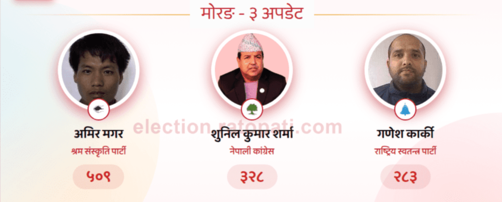 उनलाई काँग्रेसका सुनिल शर्माले ३२८ मतका साथ पछ्याइरहेका छन् । सो क्षेत्रमा राष्ट्रिय स्वतन्त्र पार्टी (रास्वपा)का उम्मेदवार गणेश कार्कीले भने २८३ मत पाएका छन् ।
