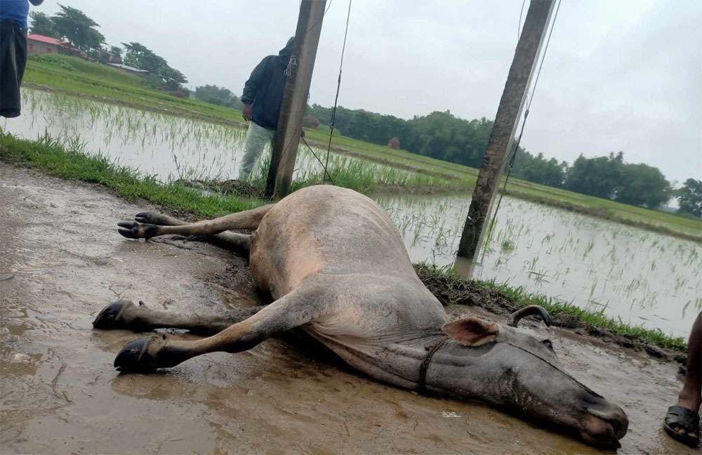कचनकवल गाउँपलिका–६ मुस्लिम बस्तिमा सडक नजिकमा रहेको विद्युतीय ट्रान्सफर्मरसहितको पोलमा करेन्ट प्रवाह हुँदा आज बिहान सोही स्थानका लक्ष्मीनारायण राजवंशीको गोरु खेतमा जोत्नलाई लाने क्रममा एक वटा गोरुलाई करेन्ट लागि घटनास्थलमै मृत्यु भएको जिल्ला प्रहरी कार्यालय झापाले जनाएको छ ।