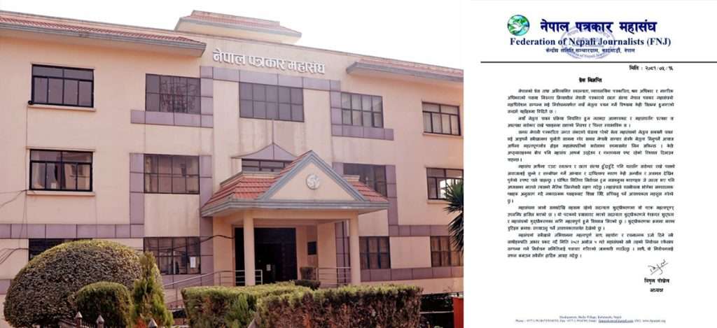 नेपाल पत्रकार महासंघको निर्वाचन आगामी ५ असोजमा हुने भएको छ। अध्यक्ष विपुल पोखरेलले आइतबार विज्ञप्तिमा जारी गरेर निर्वाचन ५ असोजमा हुने जानकारी दिएका हुन् ।