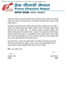 झापा । प्रेस चौतारी नेपालका केन्द्रीय अध्यक्ष गणेश बस्नेतलाई पक्राउ गर्ने प्रहरी प्रयासप्रति प्रेस चौतारी झापाले गम्भीर आपत्ति जनाएको छ । अनलाइन न्यूज पोर्टलमा प्रकाशित समाचारको विषयलाई लिएर प्रहरीले बिहीबार धरपकड गर्दै जबरजस्ती पक्राउ गर्न खोजेको प्रति प्रेस चौतारी नेपाल, झापा गम्भीर आपत्ति जनाएको हो ।