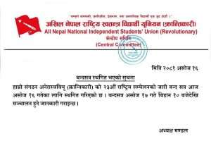 १६ असोज, काठमाडौं । अखिल क्रान्तिकारीको २३ औं राष्ट्रिय सम्मेलन हलमा तोडफोड गरिएको छ । बन्द सत्र बस्दै नबसी बिहीबारका लागि सारिएपछि आक्रोशित प्रतिनिधिहरुले सम्मेलन हलमा कुर्सि तोडफोड गरेका हुन् । कीर्तिपुरस्थित त्रिभुवन विश्वविद्यालयमा १० असोजदेखि सुरु भएको सम्मेलनको बन्दसत्र उमेर हद कायम गर्ने कि नगर्ने भन्ने विवादले प्रभावित बनेको छ ।