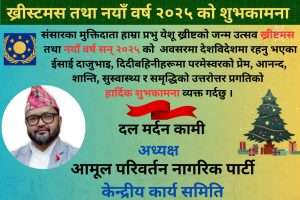 धरान । आमूल परिवर्तन नागरिक पार्टी धरान उपमहानगर समितिले ख्रीष्टमस, उधौली, चासोक तङ्नाम, यमरी पुन्ही, तमु ल्होसार, र ईस्वी संवत (नयाँ वर्ष) लगायतका चाडपर्वहरूको अवसरमा शुभकामना आदान प्रदान कार्यक्रम आयोजना गरेको छ।