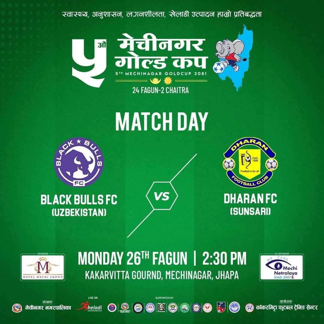 आज पाँचौं मेचीनगर गोल्डकपमा धरान एफसीले उज्वेकिस्तानको व्ल्याक बुल्स एफसीको सामना गर्दै